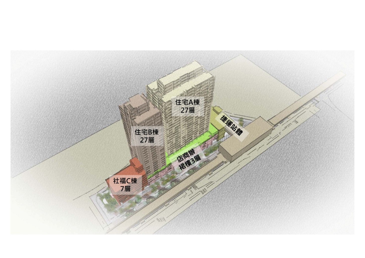 本捷運開發大樓規劃一幢三棟建築物,為捷運設施地上四層、AB棟地上二十七層、C棟地上七層,地下三層之建築物。主要空間作店舖、商場、一般事務所、社福設施及集合住宅等使用。