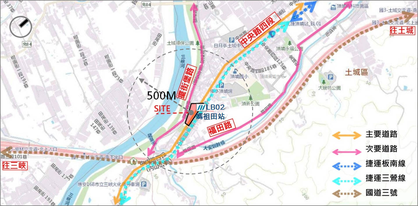 LB02媽祖田站為三鶯線第二站,計有1處出入口,本案為LB02媽祖田站出入口1,位處中央路四段與中央路四段410巷交叉口西南側,距頂埔科技產業園區約1公里,向北通達土城、板橋核心、往南連接三峽北大特定區,向西鄰近三峽河擁有自然景觀,周邊生活設施包含媽祖田河濱公園、水岸自行車道、頂新祖田市民活動中心、新北市立圖書館土城祖田圖書閱覽室、土城頂埔公共托老中心等便利生活服務機能,學校資源包含頂埔雙語國小等教育資源,在地生活的日常需求可充分滿足。